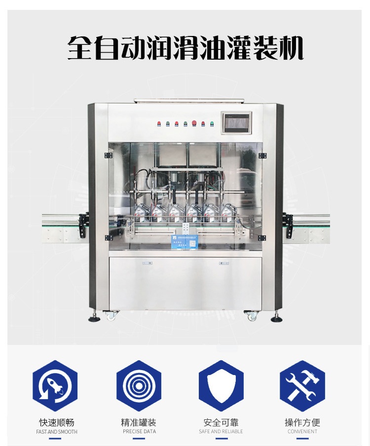 该六头柱塞式全自动润滑油灌装机独特的灌装头设计及真空回吸系统,确保灌装过程无残油滴漏,快慢双速灌装,灌装速度可调,杜绝溢瓶现象。