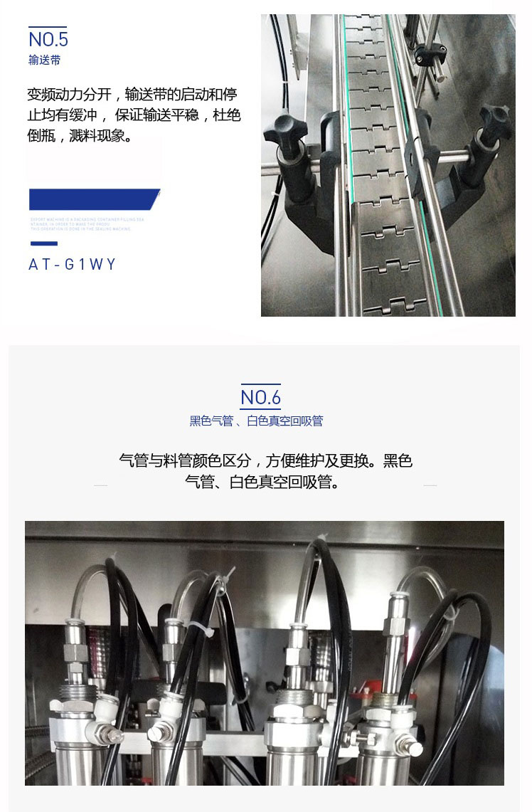 该六头柱塞式全自动润滑油灌装机特的灌装头设计及真空回吸系统,确保灌装过程无残油滴漏,快慢双速灌装,灌装速度可调,杜绝溢瓶现象。该机采用动力灌装,无需配装高位罐,简化了安装工序,提高了灌装效率。履带式压盖机,稳定无噪音,无空压现象。触摸屏界面友好,操作简捷,SIEMENS PLC控制系统,运算速度快,性能稳定,品质卓越。电、气件均采用精品元件,确保整机运作稳定。