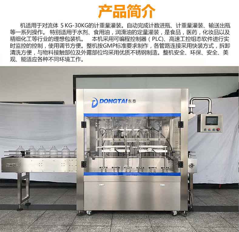 本机适用于对流体5kg-30kg的计重量灌装。自动完成计数进瓶、计重量灌装、输送出瓶等一系列操作。 特别适用于水剂、食用油,润滑油的定量灌装,是食品,医药,化妆品以及精细化工等行业的包装机。本机采用可编程控制器(PLC)、高速工控组态软件进行实时监控的控制,使用调节方便。整机按GMP标准要求制作,各管路连接采用快装方式,拆卸清洗方便,与物料接触部位及外露部位均采用优质不锈钢制造。整机安全、环保、安全、美观、能适应各种不同环境工作。