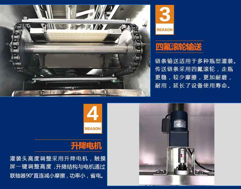 3.灌装头高度调整采用升降电机,触摸屏一键调整高度,升降结构与泵通过联轴器90°直连减小摩擦,功率小,省电;