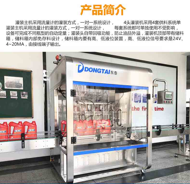 全自动润滑油灌装主机采用流量计的灌装方式,一对一系统设计,4头灌装机采用4套供料系统单灌装主机采用流量计的灌装方式
