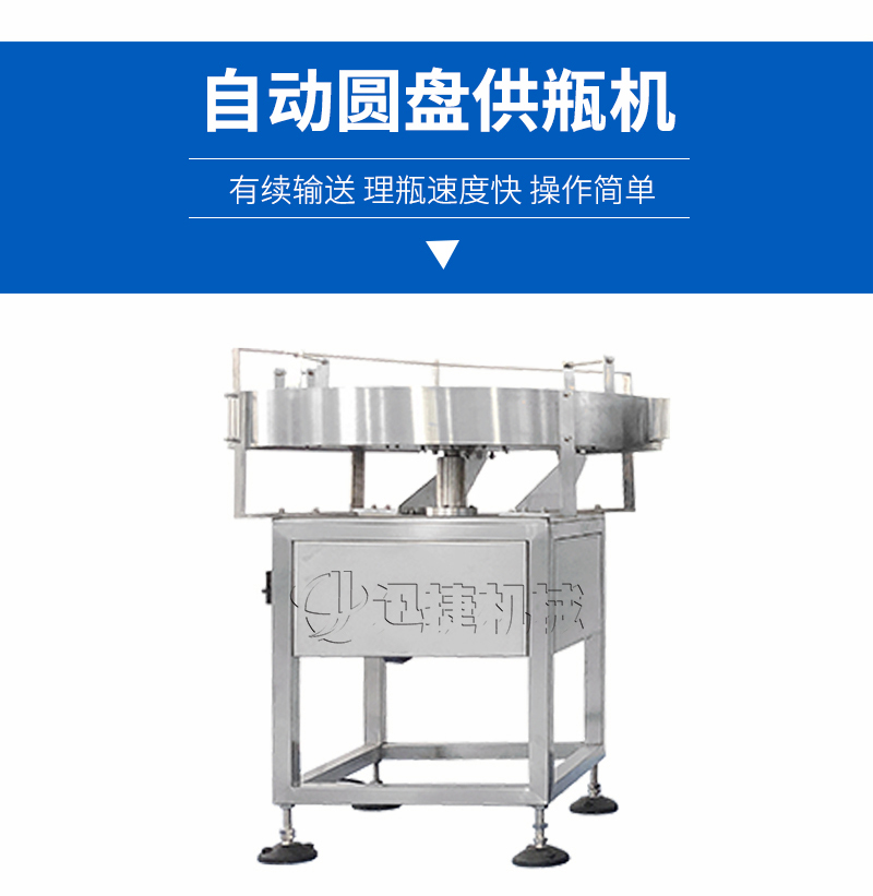 该圆盘供瓶机理瓶机是由人工将瓶子放入圆形转盘上,转盘转动将瓶子有续拨入输送带,进入灌装机进行灌装。使用方便,噪音小,理瓶速度快,操作简单是不可缺少的一个环节。