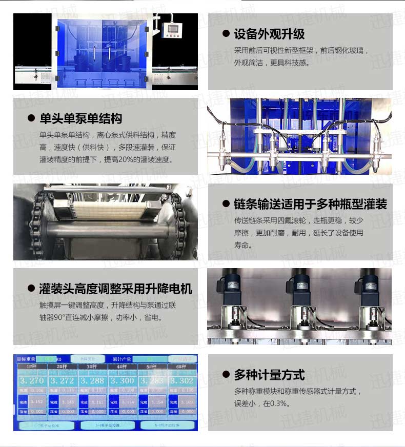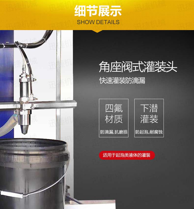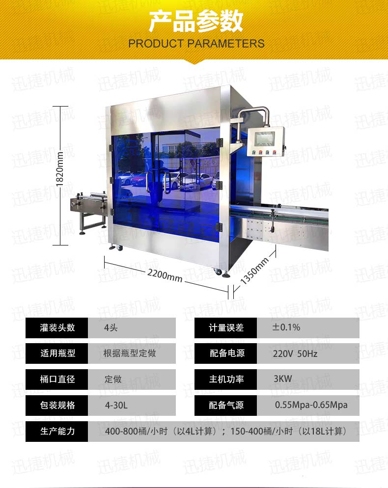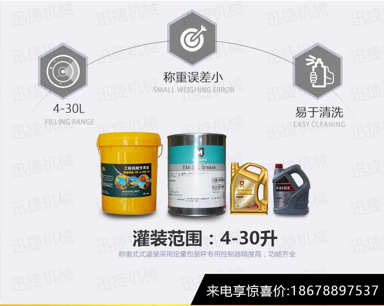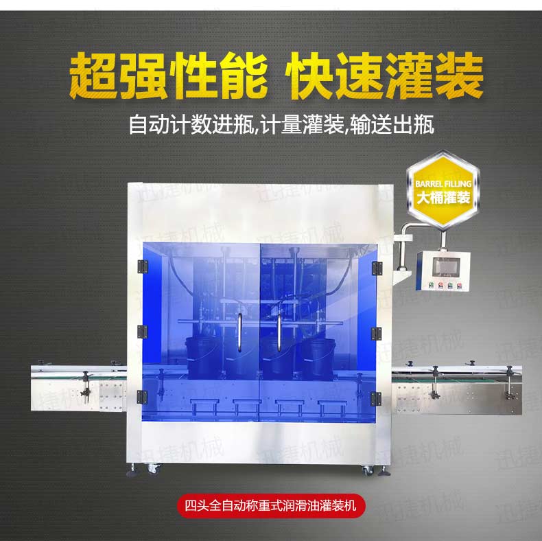 机油灌装机适用于对4kg-25kg汽车用品类产品:润滑油、防冻液、车用尿素等液体灌装。自动完成计数进瓶、计重量灌装、输送出瓶等一系列操作。 特别适用于润滑油、水剂、食用油的定量灌装,是食品,医药,化妆品以及精细化工等行业的理想灌装机。本机采用可编程控制器(PLC)、高速工控组态软件进行实时监控的控制,使用调节方便。整机按GMP标准要求制作,各管路连接采用快装方式,拆卸清洗方便,与物料接触部位及外露部位均采用不锈钢制造。整机安全、环保、安全、美观、能适应各种不同环境工作。
