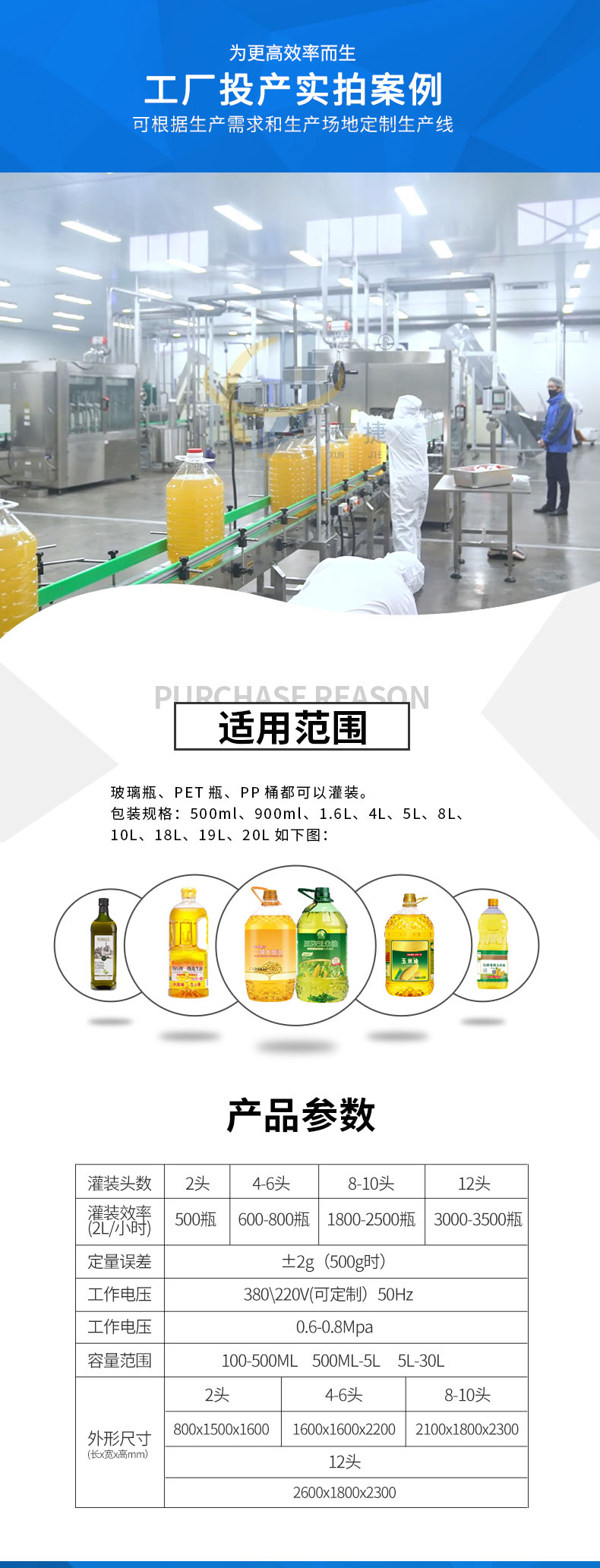 全自动食用油灌装机适用于玻璃瓶、PET瓶、PP桶都可以灌装。包装规格:500ml、900ml1.6L、4L、5L、8L、10L、18L。