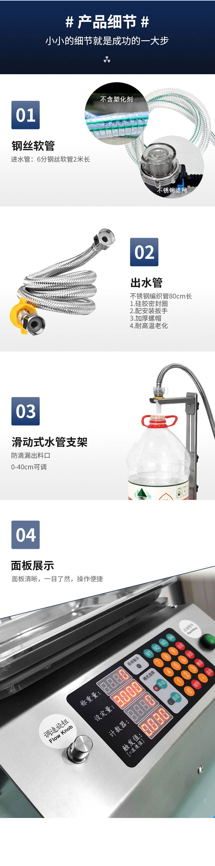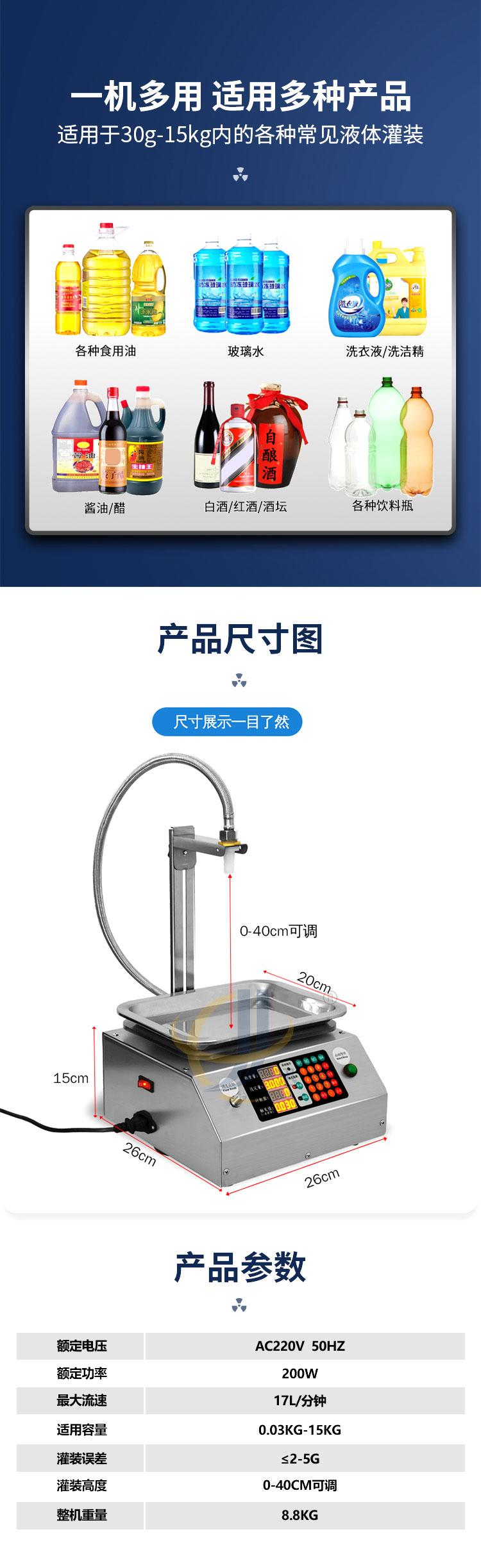 称重式液体灌装机适用于30g-15kg内的各种常见液体灌装。采用精度高,反应灵敏的电子秤作为计量标准。其性能可以超越所有时间定量的方式。