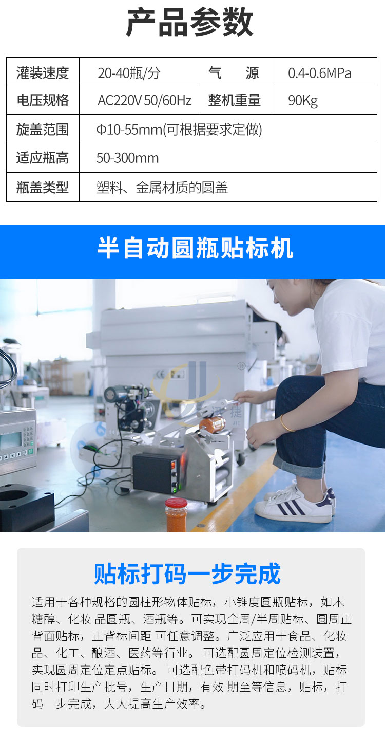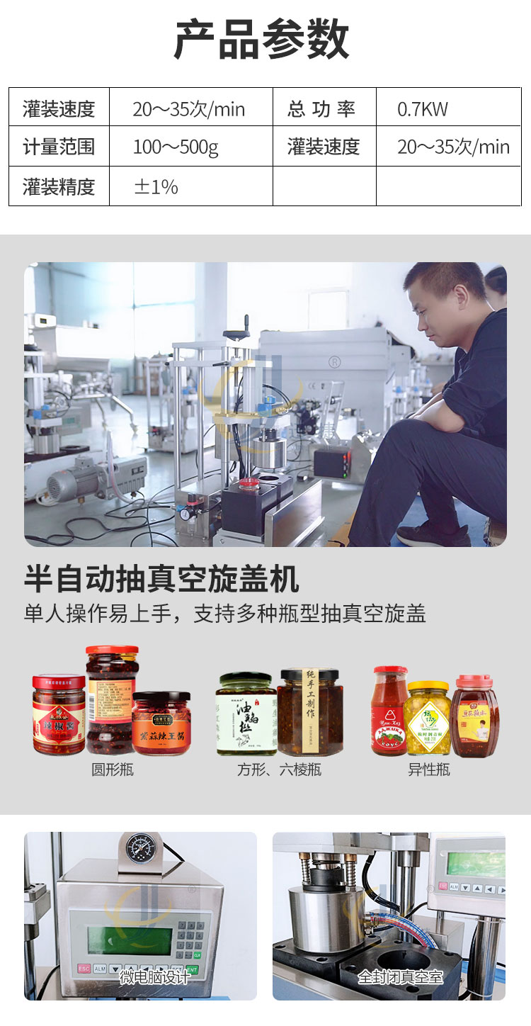 小型酱料灌装生产线又名酱料灌装三??停砂胱远戳瞎嘧盎?半自动真空旋盖机+半自动圆瓶贴标机组合而成。该灌装机适用于辣椒酱、豆瓣酱、大块肉酱等物品的定量充填分装。