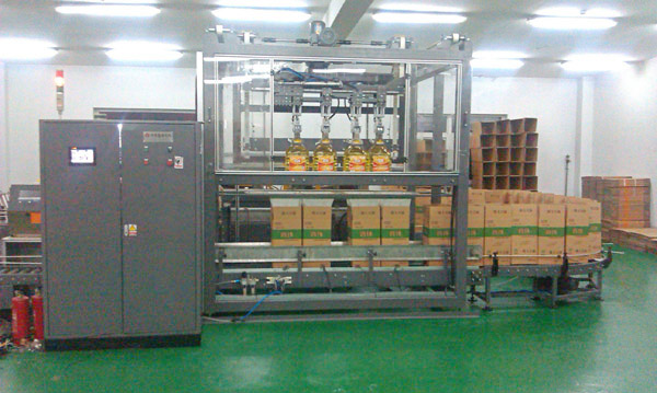 2. 油桶机器人自动装箱机采用双层输送进料方式:占地面积小,简化装箱输送系统,降低整机设备投资成本。