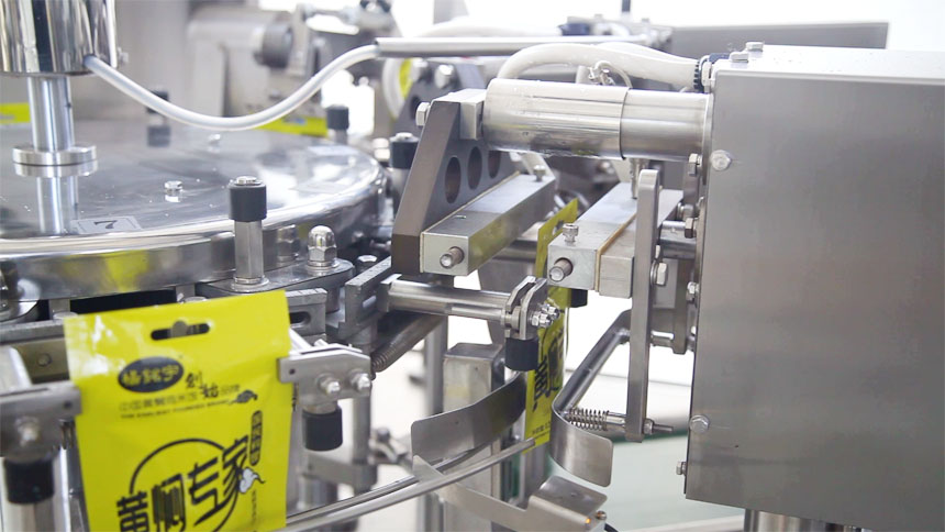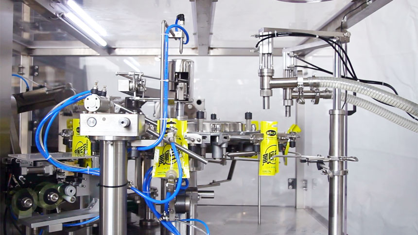这套全自动给袋式液体酱体包装机主要适用于液体/酱体类:洗涤剂、黄酒、酱油、米醋、果汁、饮料、番茄酱、花生酱、果酱、辣椒酱
