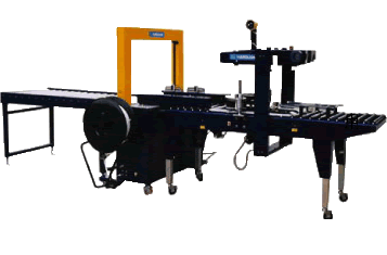 该打包封箱机自动封箱,自动捆扎,光电感应,精确无误,自动输送,自动转向,可调节打包距离。