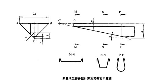 象鼻成型器的制造一般采用不锈钢薄板,要求外表面光滑乎整。其三角部分和圆弧槽部分可用整块板料卷曲而成,因为它们的展开宽度是相等的。下图所示是象鼻成型器结构及展开图,沿虚线卷折即可制得成型器,图中参数可通过计算加以选择。