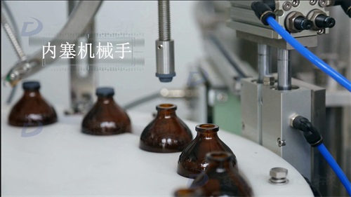 内塞机械手将内塞吸起来,然后精准压进瓶口