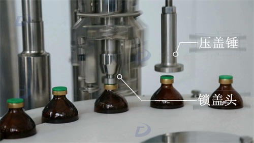 挂好盖子后,压盖锤把盖子压到底;锁盖头通过爪刀将瓶盖与瓶身轧为一体