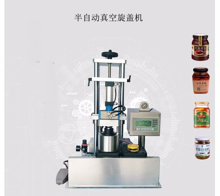 半自动辣椒酱真空旋盖机顾名思义是旋盖真空一体机,集抽真空旋盖于一体。