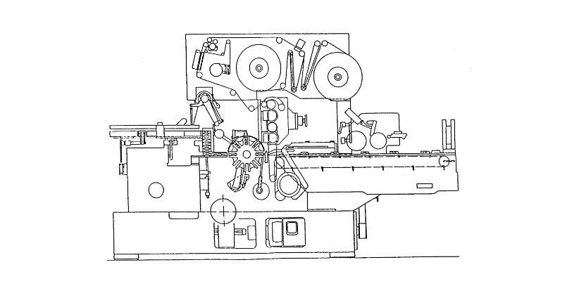 (二)机械传动   401型小包薄膜包装机由立励磁的直流分路绕线式电机提供驱动力。主电机 (2)通过定时皮带 (3)带动主传动轴 (1),主传动轴 (1)将动力分配成5路。     主传动轴上的齿轮系 (10)传动轴 (15),轴 (15)通过伞齿轮体 (12)带动定时皮带 (11)。定时皮带 (11)驱动分离轮 (13)和传送轮 (14)2路 ,主传动轴上的锥齿轮副 (8)带动偏心圆盘 (16)和连杆 (17),拖动行走架 (18)和输人推送器 (19)作往复直线运动。