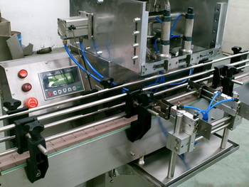 本机与物料接触均为不锈钢制作,完全符合GMP标准。快速活接连接,拆洗方便,灌装量、灌装速度均可调节,更 换不同规格形状的瓶子,不需更换零件,调整容易。另灌装头设有防滴漏装置,灌装无拉丝、滴漏;有瓶灌装、无瓶不灌装;设有计数功能,能准确显示当前产量、 前班产量;并备有自动加料控制接口,实现对加料的自动控制。各动作平稳、准确无误,是目前较为理想的机电气一体化产品。(该设备需要配备辅助设备:真空泵,真空储气罐)